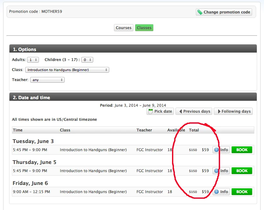 After you click OK, you will see the adjusted price for the class listed - now select your date and complete the registration: